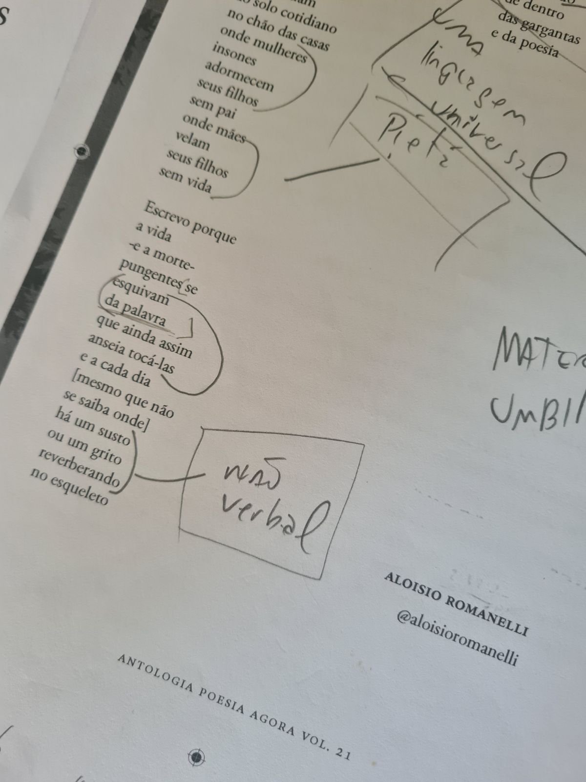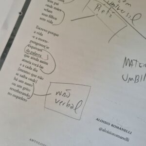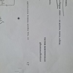 Entre os poemas selecionados para a presente antologia, “Passional da Língua”, de Victor Bartoncello, e “No Encalço”, de Aloisio Romanelli, se destacaram pela inventividade metalinguística, exploram as dinâmicas da linguagem em duas pontas: o primeiro a coloca em diminuto, vemos nascer um dialeto entre amantes; e o segundo a tem numa aura poética em vibração com os fatos da vida que “se esquivam da palavra”.