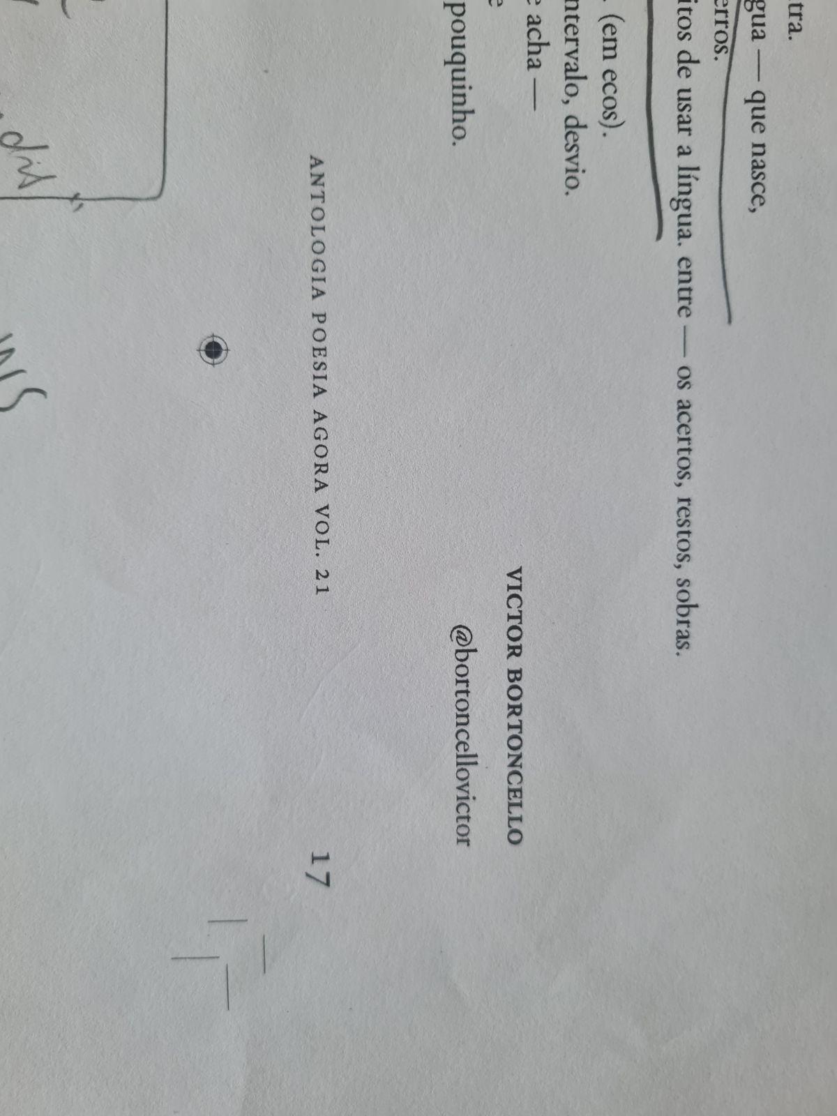O poema do Victor tece a intimidade, palavra a palavra, certas ou desastradas, e a observa também através da língua e trejeitos. Será o amor, por que não, o menor dos dialetos? Um novo amor no mundo, o fim de um amor: inauguram e extinguem jeitos únicos, primatas, de se fazer entender ali, no instante. “Desaprende o português” para que uma “outra língua” possa nascer com coragem.